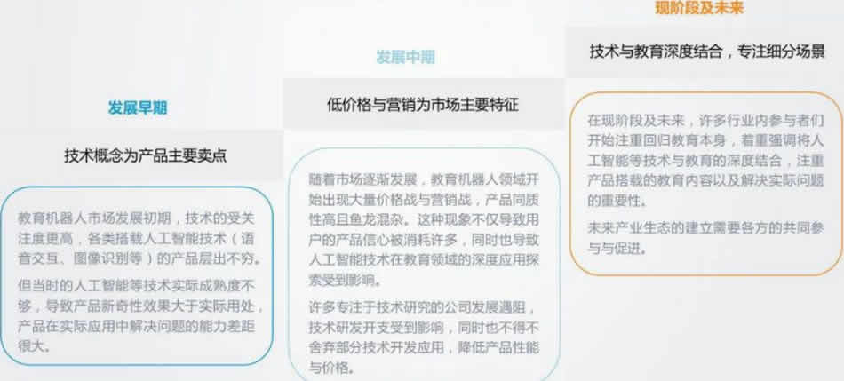 教育機(jī)器人經(jīng)歷了從概念先行到價(jià)格營(yíng)銷到回歸內(nèi)容與價(jià)值本質(zhì)的發(fā)展階段變遷。