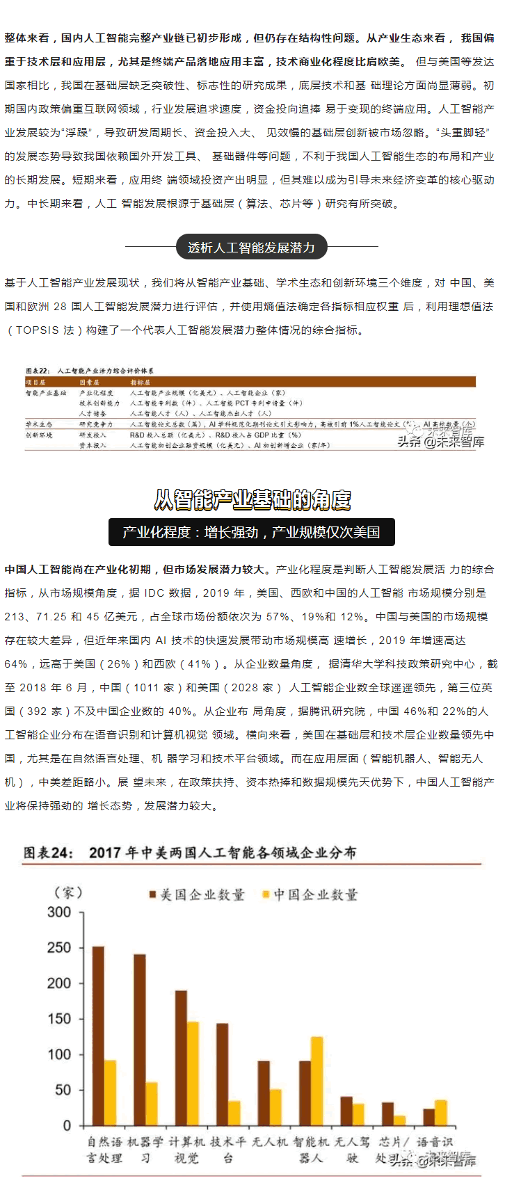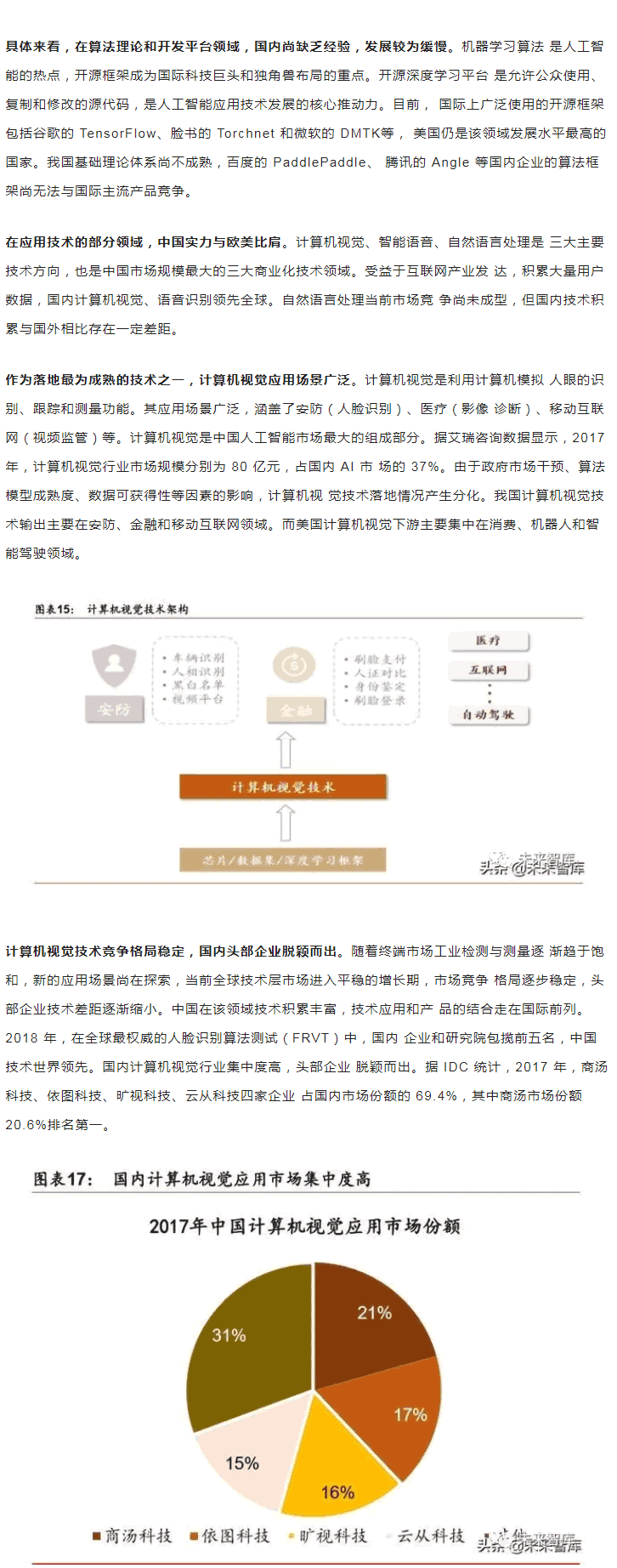 范圍內(nèi),中美“雙雄并立”構(gòu)成人工智能梯隊(duì),日本、英國(guó)、以色列和法國(guó)等發(fā) 達(dá)乘勝追擊,構(gòu)成第二梯隊(duì)。同時(shí),在D層設(shè)計(jì)上,多數(shù)強(qiáng)化人工智能戰(zhàn)略布局, 并將人工智能上升至戰(zhàn)略,從政策、資本、需求三大方面為人工智能落地保駕護(hù)。后起之秀的,局部L域有所突破。人工智能起步較晚,發(fā)展之路幾經(jīng)沉浮。自 2015 年以來(lái),政府密集出臺(tái)系列扶植政策,人工智能發(fā)展勢(shì)頭迅猛。由于初期我國(guó)政策 側(cè)重互聯(lián)網(wǎng)L域,資金投向偏向終端市場(chǎng)。因此,相比美國(guó)產(chǎn)業(yè)布局,技術(shù)層(計(jì)算 機(jī)視覺(jué)和語(yǔ)音識(shí)別)和應(yīng)用層走在世界前端,但基礎(chǔ)層核心L域(算法和硬件算力)比較 薄弱,呈“頭重腳輕”的態(tài)勢(shì)。當(dāng)前我國(guó)人工智能在戰(zhàn)略層面上強(qiáng)調(diào)系統(tǒng)、綜合布局。