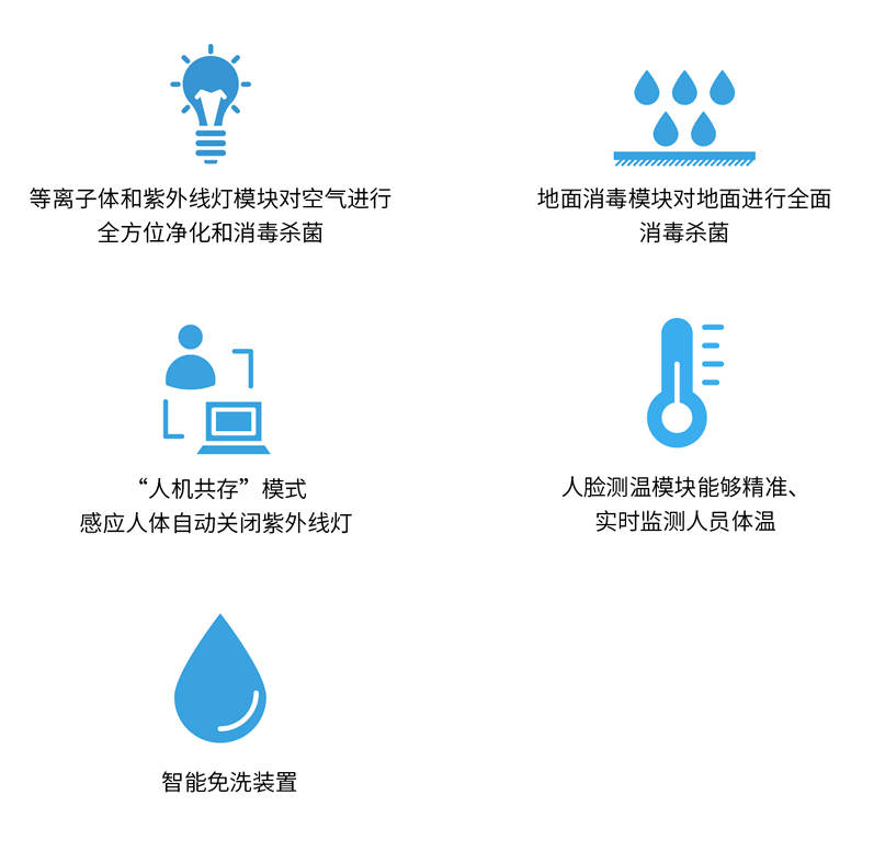 采用等離子體和G強(qiáng)度紫外線燈模塊對空氣進(jìn)行全方位凈化和消毒殺菌;同時地面消毒模塊對地面進(jìn)行多面消毒殺菌。產(chǎn)品具有“人機(jī)共存”模式,并配置人體感應(yīng)模塊自動關(guān)閉紫外線燈,保證人員安全。同時自帶人體人臉測溫模塊能夠準(zhǔn)確、實(shí)時監(jiān)測人員體溫狀況并對異常體溫實(shí)時通報(bào)處置。產(chǎn)品智能免洗裝置,給用戶提供更加方便有效的衛(wèi)生需求。