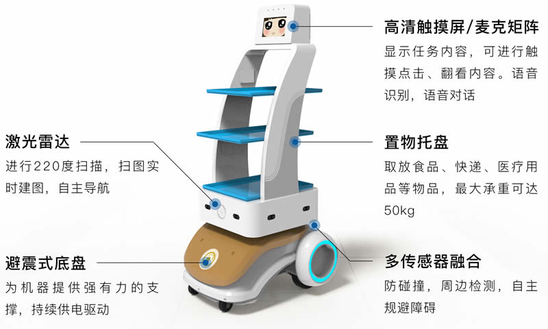 智能配送機(jī)器人是一款針對(duì)現(xiàn)代化使用環(huán)境開(kāi)發(fā)的智能機(jī)器人。具有自主行走,自主避障,防跌落,自主語(yǔ)音提示、自主充電、防跌落等功能。多載體設(shè)計(jì),適合車(chē)站、校園、醫(yī)院、物流、機(jī)場(chǎng)、酒店、商場(chǎng)等多場(chǎng)合、多用途使用,在降低人員勞動(dòng)強(qiáng)度的同時(shí),大幅度節(jié)省運(yùn)營(yíng)成本,提G工作效率,提升服務(wù)質(zhì)量,幫助實(shí)現(xiàn)工作場(chǎng)景信息化、智能化、科技化、現(xiàn)代化,提供良好的服務(wù)體驗(yàn)。
