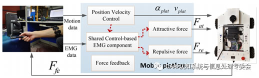 除了使用遙操作技術(shù)對機械臂或者機器手的控制,2020年西英格蘭大學(xué)的楊辰光團隊提出了一種用于全向移動機器人的EMG與觸覺設(shè)備混合控制方法[8]。這種混合共享控制方法基于肌電圖和人工勢場,用以根據(jù)排斥力和吸引力避開障礙物,并基于移動平臺的力反饋增強人類對遠程環(huán)境的感知。這種共享控制方法使遙操作者遠程控制移動機器人的運動并同步實現(xiàn)避障。與傳統(tǒng)的共享控制方法相比,該提議的方法提供了基于肌肉激活的力反饋,并驅(qū)動操作者以可預(yù)測的方式更新其控制意圖。終通過各種避障實驗表明這種遙控方法對移動機器人控制的有效性。