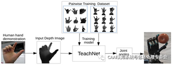 2019年,德國漢堡大學(xué)張建偉課題組和清華大學(xué)孫富春課題組共同提出TeachNet,一個直接從人類手指深度圖獲取機器人關(guān)節(jié)角度的深度學(xué)習(xí)網(wǎng)絡(luò)[10]。這種方法只需使用一個深度相機,并實現(xiàn)端到端地控制機器人,是非常直觀和用戶友好的遙操作方法。TeachNet結(jié)合了一個一致性損失函數(shù)consistency loss,可以處理人手和機器手的外觀和內(nèi)在結(jié)構(gòu)差異。這個網(wǎng)絡(luò)的訓(xùn)練依賴于一個合成的400K人手-機器手數(shù)據(jù)集,其中人手數(shù)據(jù)來自于人手位姿深度圖像數(shù)據(jù)集BigHand2.0,然后在Gazebo中采集對應(yīng)每個人手的的機器手深度圖像。后,作者在5個不同操作者的抓取實驗中證明了TeachNet的穩(wěn)定性和G效率。但是這種方法僅限于機器手的控制,無法移動機械手使之在可達工作空間內(nèi)進行抓取。