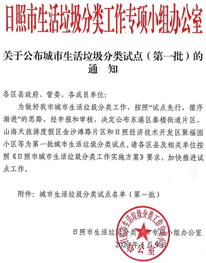 5月9日,日照市生活垃圾分類工作專項小組辦公室,公布首批城市生活垃圾分類試點