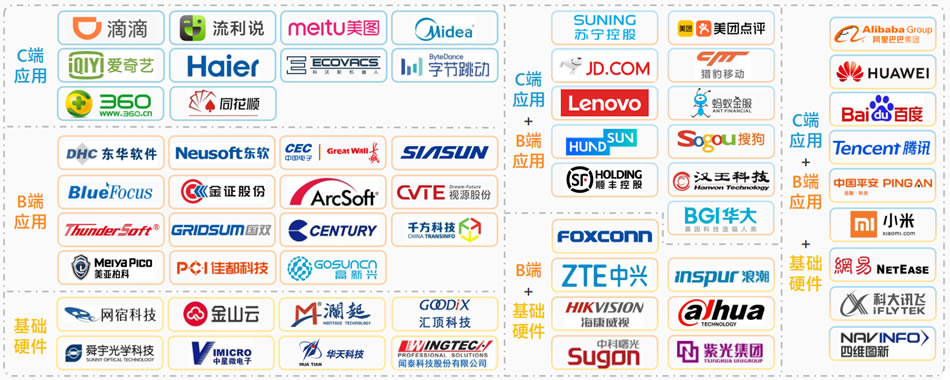 2019年巨頭企業(yè)名單:阿里巴巴,百度,字節(jié)跳動,滴滴,華為,?低,恒生電子,京東,科大訊飛,美團點評,美的,螞蟻金服,千方科技,騰訊,小米,東軟...