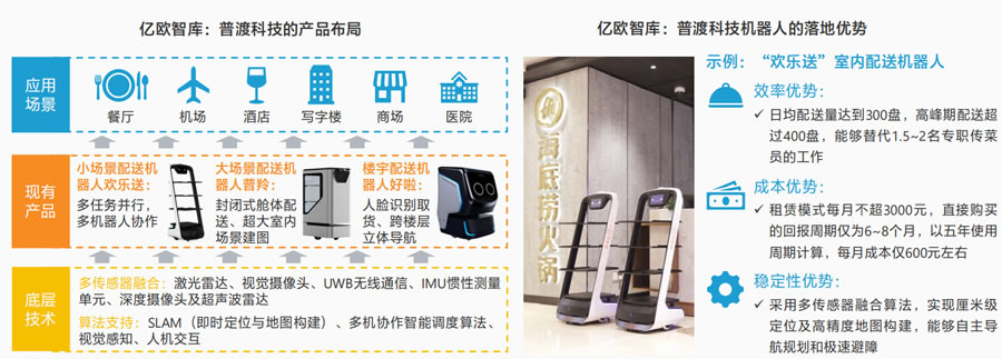普渡科技綜合了SLAM、智能導航避障、多機調(diào)度、人機交互等人工智能技術(shù),為餐廳、酒店、樓宇等廣泛場景提供配送機器人解決方案,在G動態(tài)的商業(yè)環(huán)境下準確建圖和定位,實現(xiàn)G效運行,優(yōu)化餐飲服務作業(yè)流程,降低企業(yè)成本。公司產(chǎn)品目前已應用于海底撈、巴奴火鍋、旺順閣、美 心、洲際酒店、喜來登酒店、萬達集團等國內(nèi)知名餐飲、酒店企業(yè),截止2019年6月公司銷售的機器人已累計運行50萬公里。未來普渡科技的產(chǎn)品 將多面覆蓋迎賓、L位、送餐、回盤等餐飲服務環(huán)節(jié),并通過IoT平臺實現(xiàn)遠程的自動運維和售后,為餐企提供更多面的智慧餐廳解決方案。