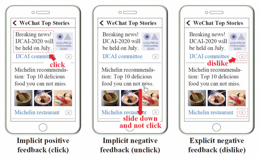 推薦系統(tǒng)在日常生活中被廣泛使用,為用戶獲取信息與娛樂提供便利。推薦系統(tǒng)算法往往基于用戶與系統(tǒng)的交互,這些交互行為可以大致分為以下兩類:顯式反饋與隱式反饋。顯式反饋從用戶對于物品的直接態(tài)度中獲取,例如評論中的一星到五星,或者微信看一看系統(tǒng)中的“不感興趣”按鈕。這類反饋能夠直接表達(dá)用戶的正向以及負(fù)向偏好,但是這類反饋的數(shù)量往往不多。隱式反饋從用戶的行為中間接獲得,例如用戶的點(diǎn)擊/不點(diǎn)擊行為。這些信息在推薦系統(tǒng)中往往是海量的,但是這些信息有著較多噪聲(用戶點(diǎn)擊的并不一定是他真正喜歡的)。另外,隱式反饋通常是以正反饋的形式出現(xiàn),推薦中的隱式負(fù)反饋存在巨大噪聲(未展現(xiàn)信息或者未點(diǎn)擊信息并不一定意味著用戶不喜歡這些內(nèi)容)。