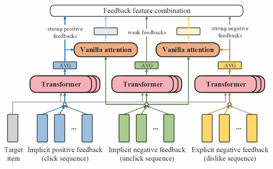 在推薦系統(tǒng)中,用戶的顯式反饋、隱式反饋、正反饋和負(fù)反饋都能夠反映用戶對于被推薦物品的偏好。這些反饋信息在推薦系統(tǒng)中十分有用。然而,現(xiàn)在的大規(guī)模深度推薦模型往往以點(diǎn)擊為目標(biāo),只看重以用戶點(diǎn)擊行為為代表的隱式正反饋,而忽略了其它有效的用戶反饋信息。