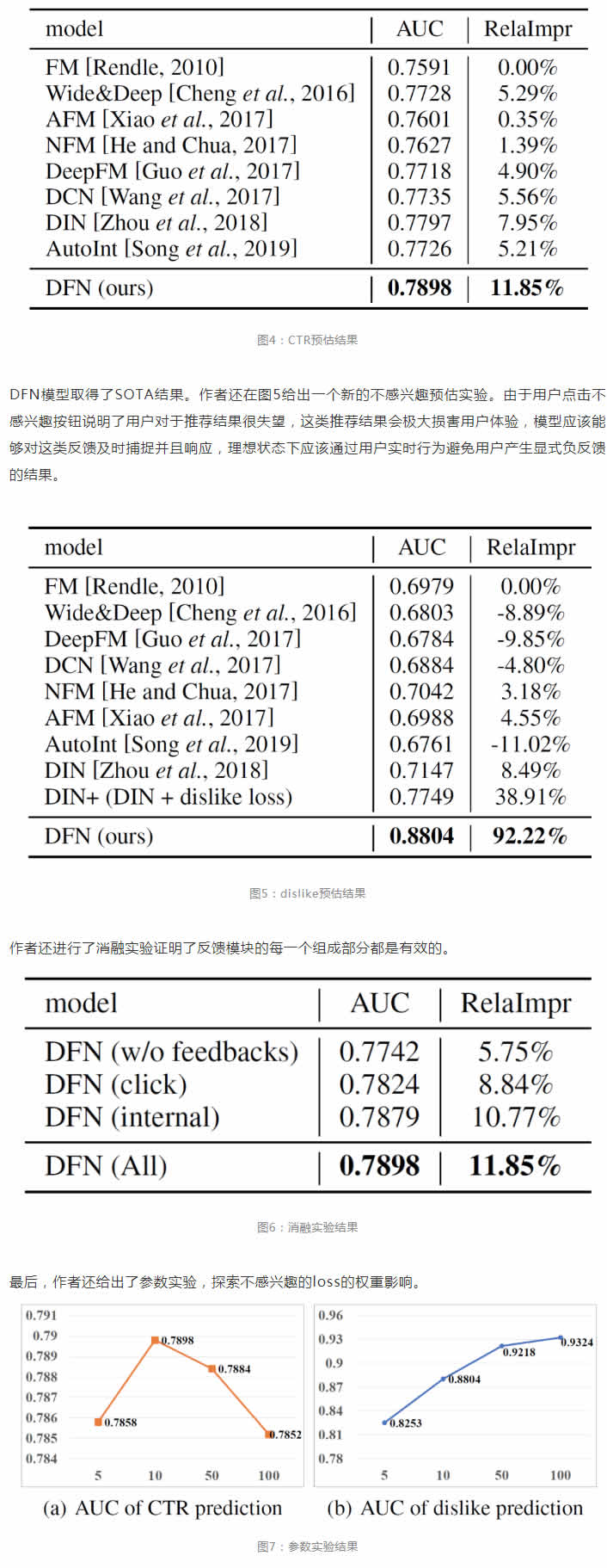 DFN模型使用了internal feedback interaction component抓住用戶行為序列中的細(xì)粒度的行為級別的交互,然后通過external feedback interaction component,使用準(zhǔn)確但稀少的隱式正反饋和顯式負(fù)反饋?zhàn)鳛楸O(jiān)督,從噪音較多的隱式負(fù)反饋中進(jìn)一步抽取用戶的正負(fù)反饋信息。在實(shí)驗(yàn)中,作者基于微信看一看的數(shù)據(jù),進(jìn)行了豐富的離線和在線實(shí)驗(yàn),模型與baseline相比均取得顯著提升。