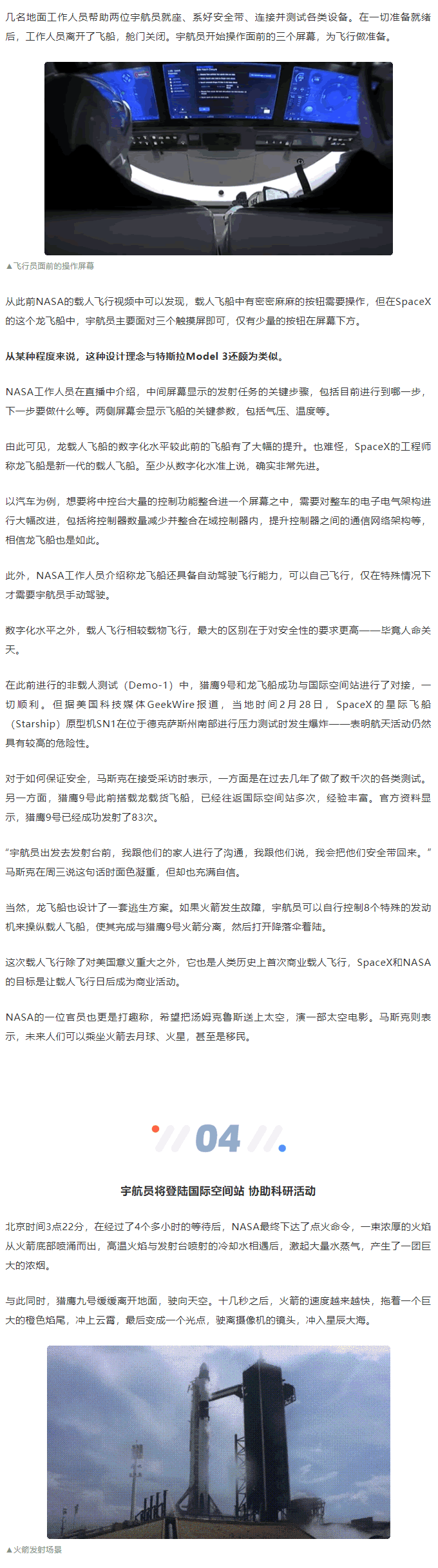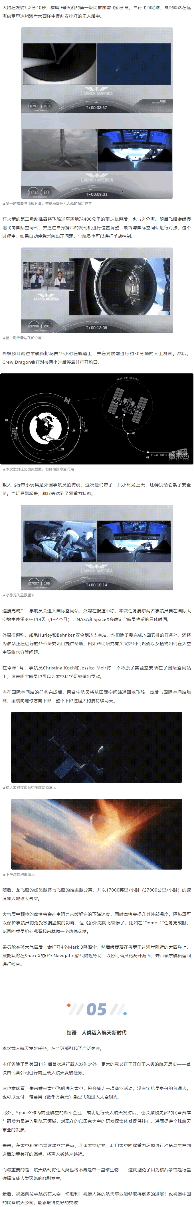 對(duì)SpaceX來說,這是其成立近20年來首次執(zhí)行航天產(chǎn)業(yè)中艱巨、技術(shù)難度G的載人航天任務(wù),意味著其航天技術(shù)實(shí)現(xiàn)了新的突破,發(fā)展到了一個(gè)新的階段,受到了NASA乃至美國官方的完全認(rèn)可。