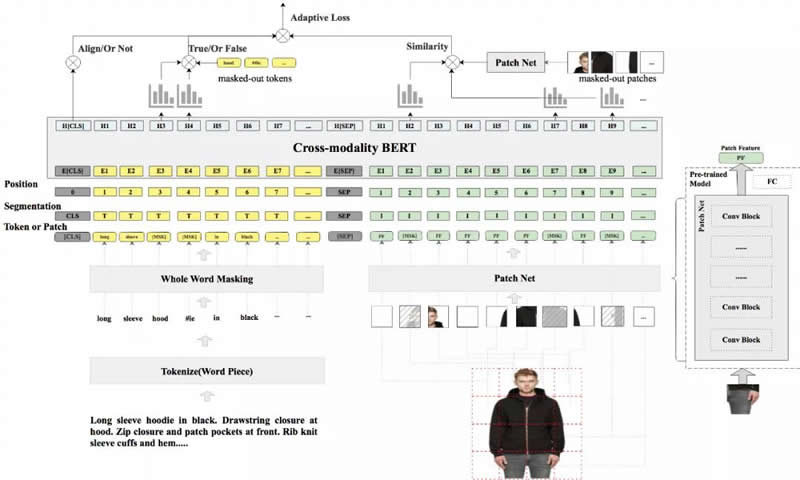 FashionBERT 整體結構如圖 2,主要包括 Text Embedding, Patch Embedding, Cross-modality FashionBERT,以及 Pretrain Tasks。