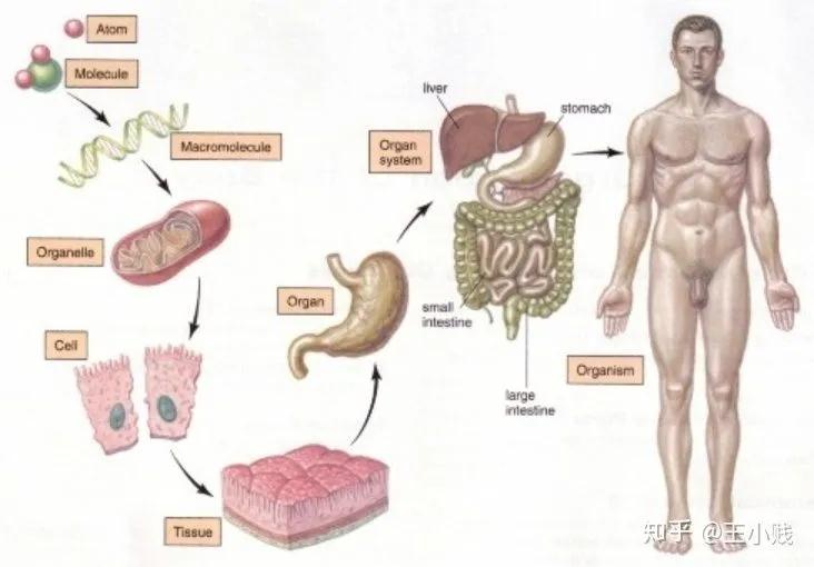 通過上一節(jié)的介紹我們也了解到,深度學(xué)習(xí)的黑箱性主要來源于其G度非線性性質(zhì),每個(gè)神經(jīng)元都是由上一層的線性組合再加上一個(gè)非線性函數(shù)的得到,我們無法像理解線性回歸的參數(shù)那樣通過非常solid的統(tǒng)計(jì)學(xué)基礎(chǔ)假設(shè)來理解神經(jīng)網(wǎng)絡(luò)中的參數(shù)含義及其重要程度、波動(dòng)范圍。但實(shí)際上我們是知道這些參數(shù)的具體值以及整個(gè)訓(xùn)練過程的,所以神經(jīng)網(wǎng)絡(luò)模型本身其實(shí)并不是一個(gè)黑箱,其黑箱性在于我們沒辦法用人類可以理解的方式理解模型的具體含義和行為,而神經(jīng)網(wǎng)絡(luò)的一個(gè)非常好的性質(zhì)在于神經(jīng)元的分層組合形式,這讓我們可以用物質(zhì)組成的視角來理解神經(jīng)網(wǎng)絡(luò)的運(yùn)作方式。比如如下圖所示,人體的組成過程是從分子-細(xì)胞-組織-器官-系統(tǒng)-人體: