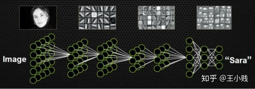 而通過一些對(duì)神經(jīng)網(wǎng)絡(luò)隱層的可視化我們也發(fā)現(xiàn):比如下圖的一個(gè)人臉識(shí)別的例子,神經(jīng)網(wǎng)絡(luò)在這個(gè)過程中先學(xué)到了邊角的概念,之后學(xué)到了五官,后學(xué)到了整個(gè)面部的特征。