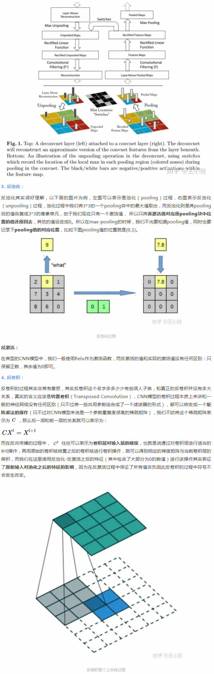 要理解神經(jīng)網(wǎng)絡(luò)中每層都學(xué)到了哪些概念一個(gè)非常直觀的方法就是通過對(duì)隱層運(yùn)用一些可視化方法來將其轉(zhuǎn)化成人類可以理解的有實(shí)際含義的圖像,這方面一個(gè)非常具有代表性的一個(gè)工作就是14年ECCV的一篇經(jīng)典之作:《Visualizing and Understanding Convolutional Networks》,這篇文章主要利用了反卷積的相關(guān)思想實(shí)現(xiàn)了特征可視化來幫助我們理解CNN的每一層究竟學(xué)到了什么東西。我們都知道典型的CNN模型的一個(gè)完整卷積過程是由卷積-激活-池化(pooling)三個(gè)步驟組成的。而如果想把一個(gè)CNN的中間層轉(zhuǎn)化成原始輸入空間呢?我們就需要經(jīng)過反池化-反激活-反卷積這樣的一個(gè)逆過程。整個(gè)模型的結(jié)構(gòu)如下圖所示: