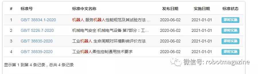 6月2日,國家市場監(jiān)督管理總局和國家標(biāo)準(zhǔn)化管理委員會發(fā)布了4項(xiàng)與機(jī)器人相關(guān)的新增國家推薦標(biāo)準(zhǔn),這4項(xiàng)標(biāo)準(zhǔn)均從2021年1月1日開始實(shí)施。
