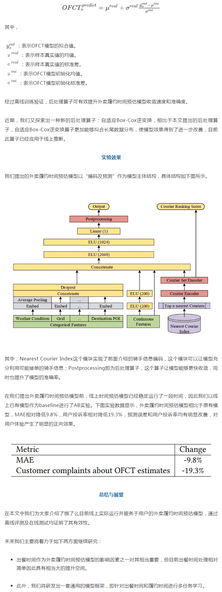外賣履約時間預估(OFCT:Order Fulfillment Cycle Time)問題相比一般的時間預估問題而言更為復雜,其中存在餐廳與用戶的供需關系、餐廳出餐時間的未知性以及騎手行為的不確定性等問題。在論文中我們向?qū)W術界首次詳細介紹外賣履約時間預估這一問題,并給出了有效的解決方案,后得到了審稿人的一致認可。