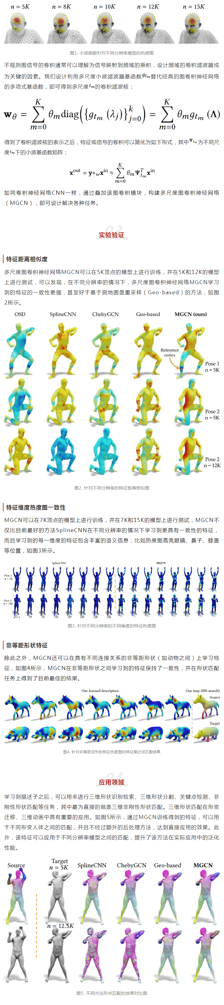 為解決現(xiàn)有圖卷積神經(jīng)網(wǎng)絡(luò)的問題,團(tuán)隊(duì)設(shè)計(jì)了一種多尺度圖卷積神經(jīng)網(wǎng)絡(luò)(multiscale graph convolutional network,MGCN)。如圖1所示,我們發(fā)現(xiàn),針對(duì)不同分辨率和連接關(guān)系的離散化,三維圖譜小波函數(shù)表現(xiàn)出J佳的魯棒性,并且不需要計(jì)算測(cè)地距離。因此,我們?cè)O(shè)計(jì)將多尺度的小波函數(shù)嵌入到圖卷積神經(jīng)網(wǎng)絡(luò)的學(xué)習(xí)當(dāng)中。