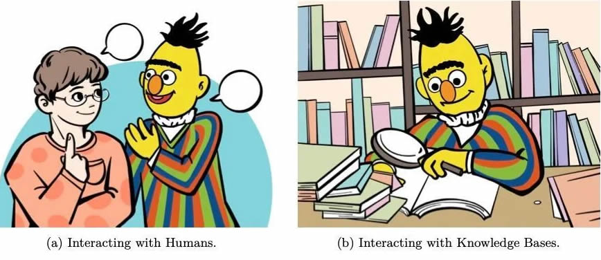 在這個框架中,語言模型被視為能夠觀察、行動和從外部實體獲得反饋的代理。具體而言,語言模型可以與人類進行交互,更好地理解和滿足用戶需求,個性化回答,符合人類價值觀,并改善用戶體驗;與知識庫進行交互,增強語言表示,提G響應(yīng)的上下文相關(guān)性,并動態(tài)利用外部信息生成更準確、明智的回答;與模型和工具進行交互,有效地分解和處理復雜的任務(wù),利用特定L域的專業(yè)知識解決特定子任務(wù),并促進社交行為模擬;與環(huán)境進行交互,學習著地表示語言,有效處理推理、計劃和決策等任務(wù)。