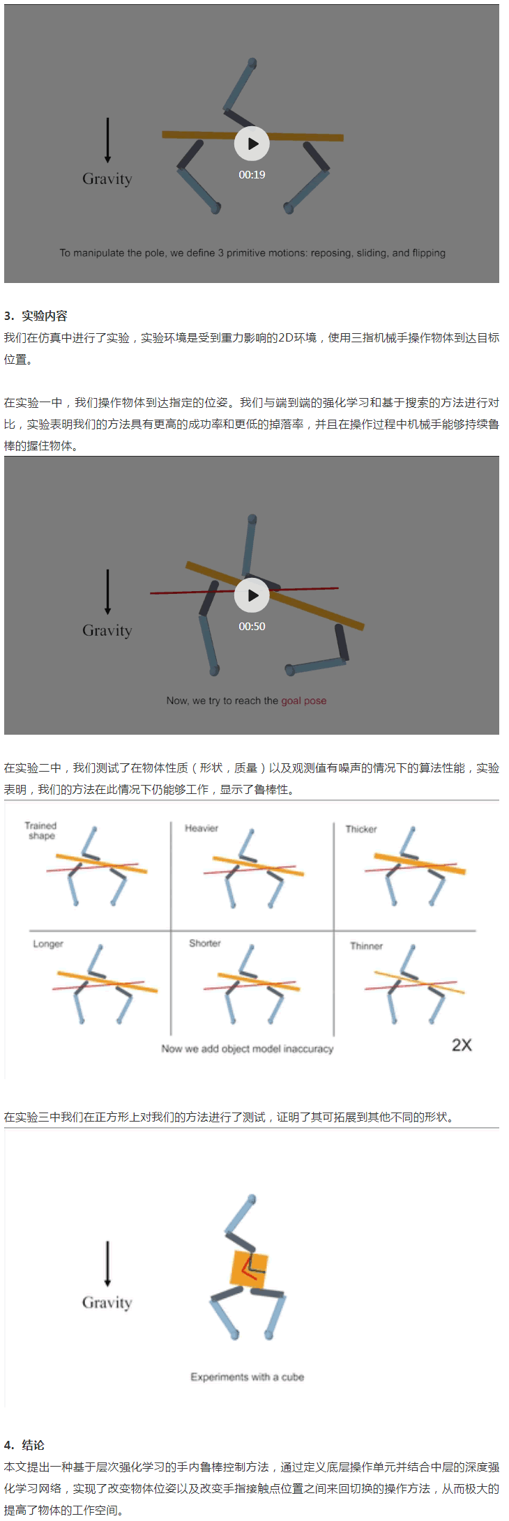 傳統(tǒng)上,手內(nèi)操作有兩類解決方案,一類是基于模型的方法(model-based method),通過對抓取的動力學(xué)建模,來控制手指移動帶動物體姿態(tài)。這種辦法好處在于穩(wěn)定性強,模型簡單,但問題在于難以實現(xiàn)較長和復(fù)雜的手內(nèi)操作流程,特別是目標(biāo)位姿和起始位姿相距很遠的情況,因為它們很難規(guī)劃手指接觸點的移動;另一類方法是無模型方法(model-free method),通常使用深度強化學(xué)習(xí)的方法。這類方法優(yōu)點在于不需要系統(tǒng)模型,但缺點在于穩(wěn)定性差,并且需要大量數(shù)據(jù)進行訓(xùn)練。而我們的方法結(jié)合了這兩種方法:在底層使用傳統(tǒng)的動力學(xué)建模方式保持穩(wěn)定的抓取和實現(xiàn)簡單基本的操作單元,在中層通過深度強化學(xué)習(xí)來進行規(guī)劃,選擇不同的操作單元,終實現(xiàn)穩(wěn)定且復(fù)雜的操作流程。我們的方法結(jié)合了兩種方法的優(yōu)點:在底層通過使用基于模型的操作單元,保證了手指與物體之間持續(xù)穩(wěn)定的抓;在中層使用強化學(xué)習(xí)進行規(guī)劃,從而實現(xiàn)較長和復(fù)雜的手內(nèi)操作流程。