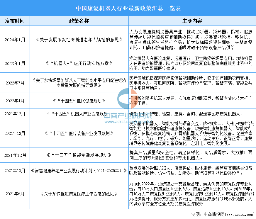 近年來,中國政府相關(guān)部門出臺了一系列政策,鼓勵和支持康復(fù)機器人產(chǎn)業(yè)的發(fā)展。例如,《關(guān)于發(fā)展銀發(fā)經(jīng)濟增進老年人福祉的意見》提出大力發(fā)展康復(fù)輔助器具產(chǎn)業(yè),《“機器人+”應(yīng)用行動實施方案》提出推動機器人在醫(yī)院康復(fù)、遠程醫(yī)療、衛(wèi)生防疫等場景應(yīng)用,《“十四五”國民健康規(guī)劃》進一步鼓勵智能服務(wù)機器人發(fā)展,實施康復(fù)輔助器具、智慧老齡化技術(shù)推廣應(yīng)用工程。政策的發(fā)布和實施將為康復(fù)機器人行業(yè)的發(fā)展提供了明確、廣闊的市場前景,為企業(yè)提供了良好的生產(chǎn)經(jīng)營環(huán)境。