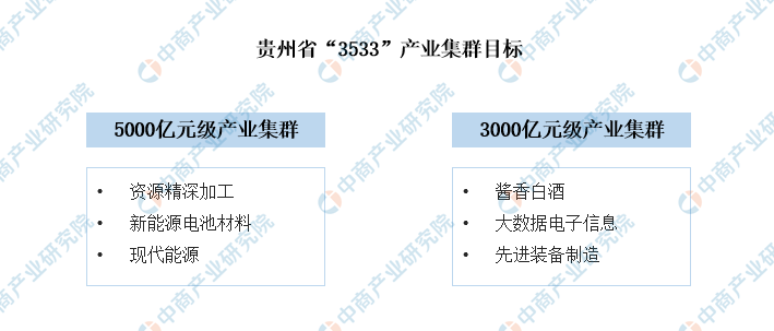 當(dāng)前貴州省錨定“3533”奮斗目標(biāo),加快構(gòu)建富有貴州特色、在國(guó)家產(chǎn)業(yè)格局中具有重要地位的現(xiàn)代化產(chǎn)業(yè)體系,到2027年形成資源精深加工、新能源電池材料、現(xiàn)代能源等3個(gè)5000億元級(jí)產(chǎn)業(yè)集群,醬香白酒、大數(shù)據(jù)電子信息、先進(jìn)裝備制造等3個(gè)3000億元級(jí)產(chǎn)業(yè)集群。