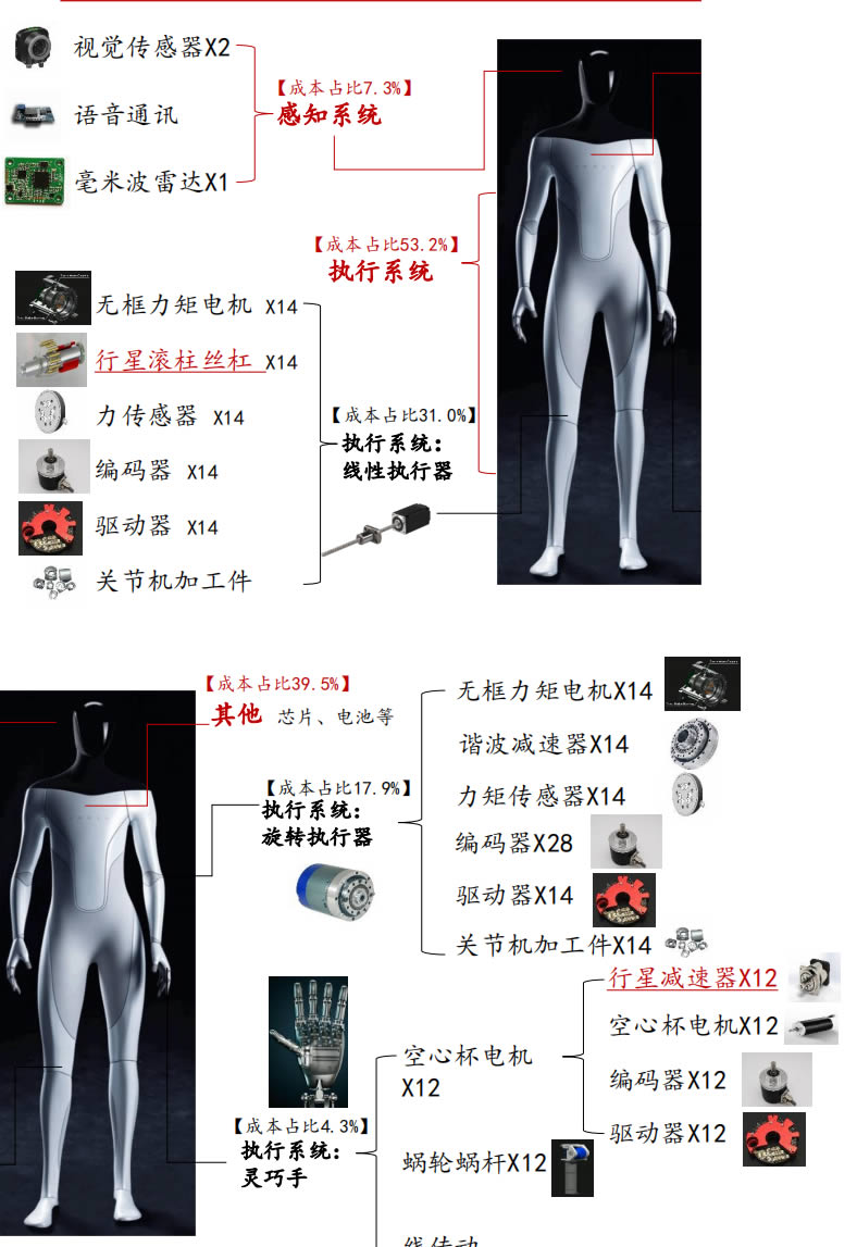 執(zhí)行系統(tǒng)BOM占比G,約53.2%(其中直線、旋轉(zhuǎn)、手部分別 占31.0%、17.9%、4.3%);感知系統(tǒng)占7.3%,其他芯片、電池等部件合計占比39.5%
