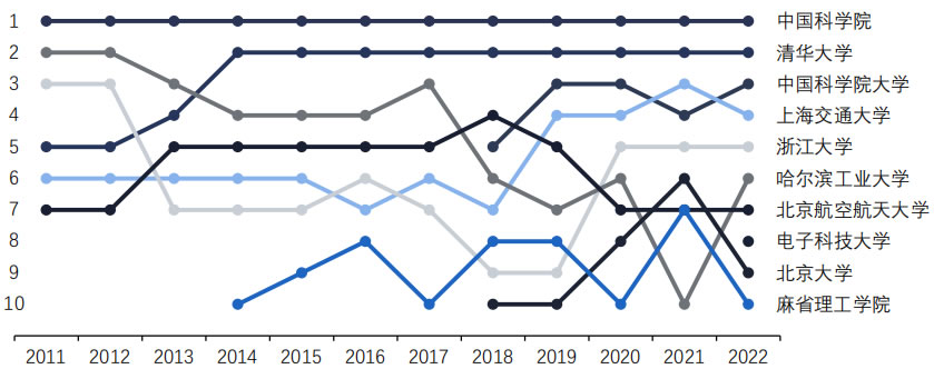 和研究深度上均位居首位,顯著L先于其他國(guó)家。其中,中國(guó)科學(xué)院在過(guò)去十年中始終位居論文發(fā)表數(shù)