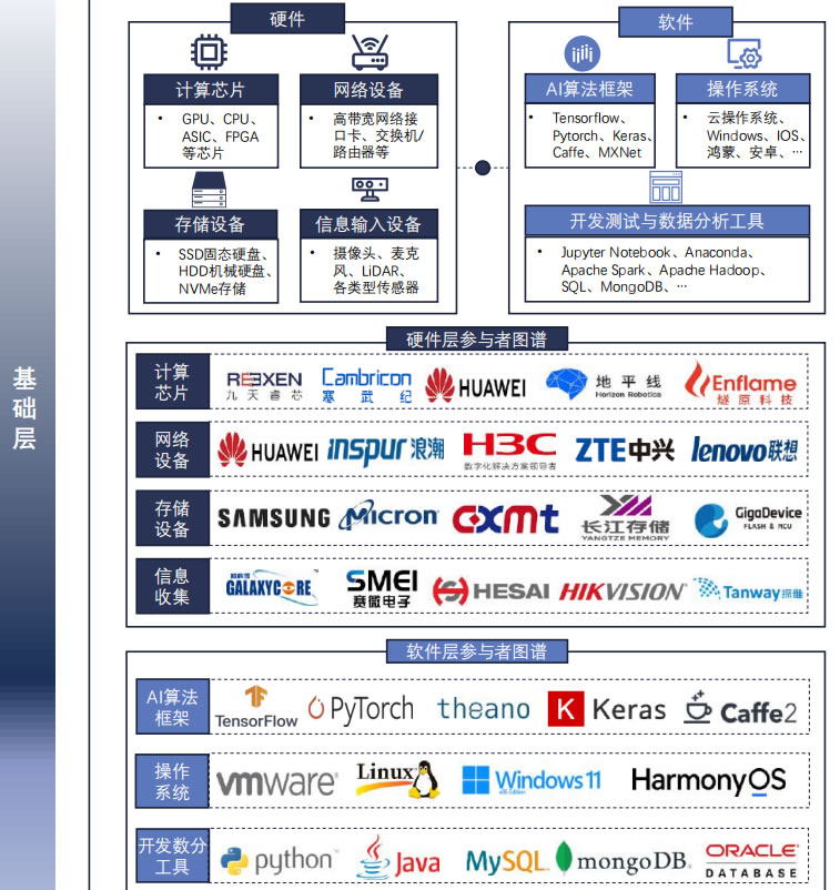 人工智能基礎(chǔ)層涵蓋計(jì)算芯片、網(wǎng)絡(luò)設(shè)備、存儲(chǔ)設(shè)備和信息采集設(shè) 備,以及操作系統(tǒng)、開發(fā)測(cè)試分析工具和AI算法框架,共同構(gòu)成了 人工智能產(chǎn)業(yè)發(fā)展的基石底座