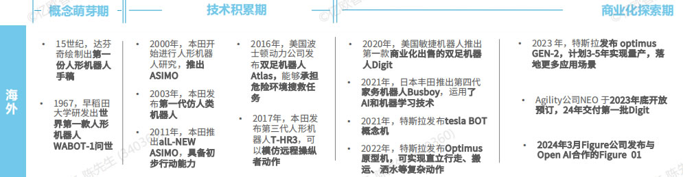海外人形機器人概念萌芽較早,以技術(shù)導向為主,較于海外,國內(nèi)以應(yīng)用突破方向為主,隨著國內(nèi)人工智能、G端制造、新材料等先進技術(shù)的繼續(xù) 積累與突破, 2023年國內(nèi)人形機器人進入集務(wù)爆發(fā)期,大批宇商推出自身人形機器人產(chǎn)品并嘗試應(yīng)用于服務(wù)、汽車等場景,逐步確索商業(yè)化落 地。