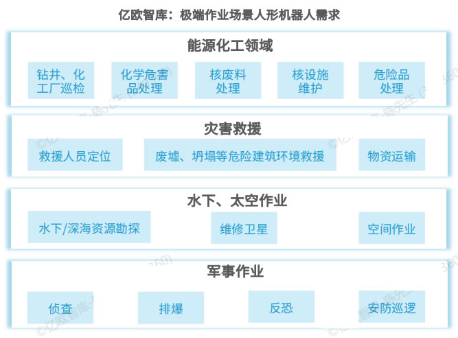 J端作業(yè)場(chǎng)景對(duì)人形機(jī)器人有廣泛的需求,人形機(jī)器人可在惡劣環(huán)境下幫助或替代救援人員操作,解決人員短缺及生命安全問(wèn)題,從而提G救援效 率、減少人員傷亡、提G物資運(yùn)輸效率等。