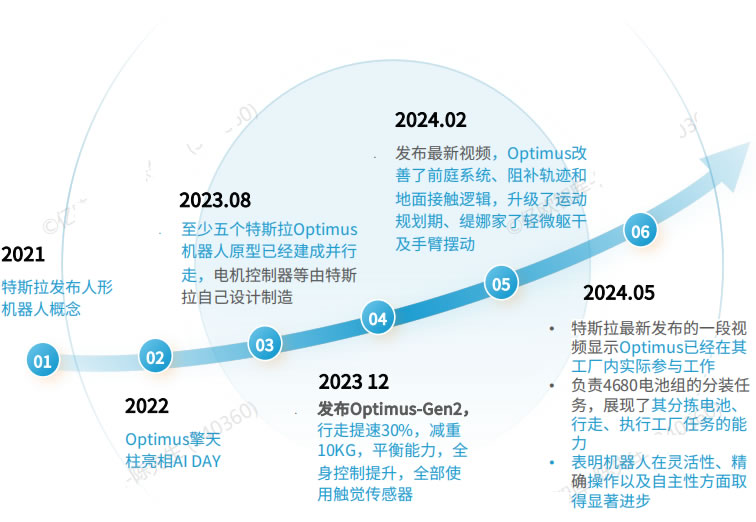 2023 年 特斯拉發(fā)布Optimus-Gen2演示視頻, 其運(yùn)動(dòng)能力、平衡性與感知能力進(jìn)—步提升,能夠?qū)崿F(xiàn)二指拿雞蛋等動(dòng)作,指尖觸覺傳感器與足部力傳感器的應(yīng)用成為核心亮點(diǎn)。特斯拉人形機(jī)器人目前放在特斯拉汽車工宇進(jìn)行實(shí)用性測(cè)試優(yōu)化,馬 斯克在2023第四季度業(yè)績(jī)交流會(huì)提出2025年實(shí)現(xiàn)人形機(jī)器人部分交付,將持續(xù)推動(dòng)商業(yè)化落地。