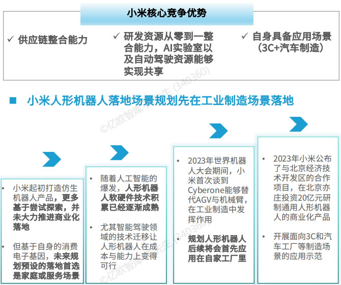 小米制造人形機(jī)器人的初衷背后主要是由于小米自2017年起就采取了“先確索后賦能” 的研發(fā)路徑,希望不斷通過自身的實(shí)踐先行—步,為產(chǎn)業(yè)鏈 賦能。由于其本身有著自己的龐大的生產(chǎn)任務(wù),從而希望人形機(jī)器人在3C和汽車制造L域,替代部分現(xiàn)在工業(yè)機(jī)器人無法模成的工作。