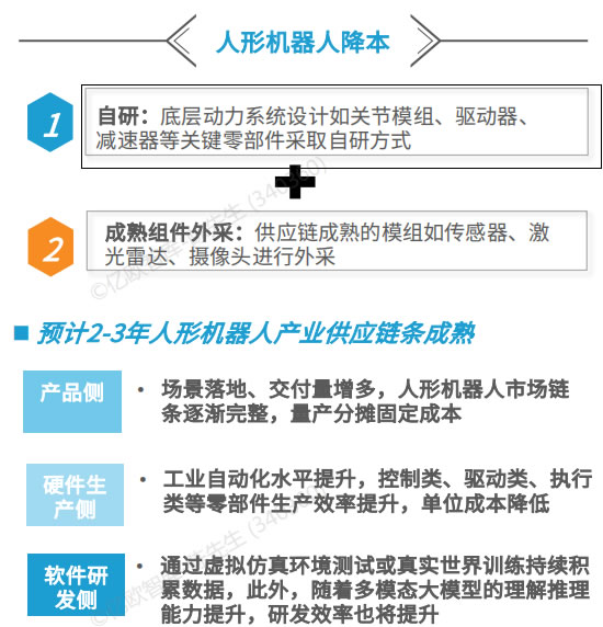 人形機(jī)器人降本是確定趨勢,供應(yīng)鏈成熟與否是實(shí)現(xiàn)降本重中之中,未來人形機(jī)器人產(chǎn)業(yè)供應(yīng)鏈也會趨向智能手機(jī)發(fā)展,達(dá)到生態(tài)成熟、規(guī)模量產(chǎn) 且成本可控的狀態(tài)。