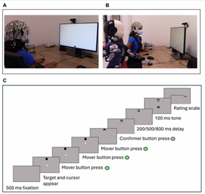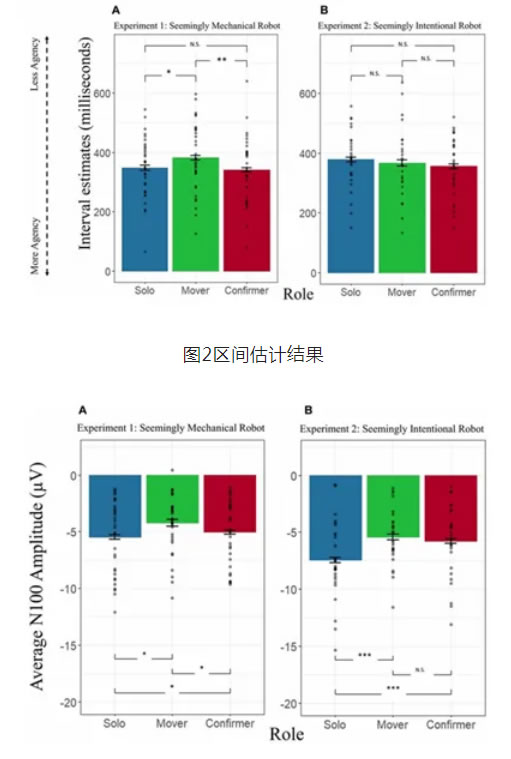 在這項(xiàng)研究中,科學(xué)家們使用了時(shí)間間隔估計(jì)任務(wù)(如圖2)和腦電圖(EEG)(如圖3)來評(píng)估人們在與機(jī)器人合作時(shí)是否能感受到共同代理感(Sense of Joint Agency, SoJA),以及這種感覺是否受到人們對機(jī)器人意圖歸因的影響。