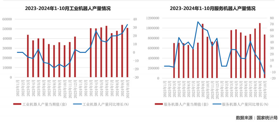 服務(wù)機(jī)器人方面,隨著新興應(yīng)用場(chǎng) 景的拓展,服務(wù)機(jī)器人市場(chǎng)需求日益旺盛,產(chǎn)量穩(wěn)定增長(zhǎng)。2024年1-10 月,我國(guó)服務(wù)機(jī)器人產(chǎn)量達(dá)到871.2萬(wàn)套,同比增長(zhǎng)18%。