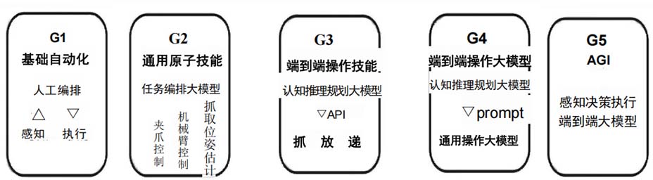 同時,智元還定義了G1 至 G5 的具身智能技術演進路線。G1 主要針對特定場景;G2 面向更多場景任務, 具有一定的泛化能力;G3 從原先的算法驅(qū)動轉(zhuǎn)變?yōu)閿?shù)據(jù)驅(qū)動;G4 引入了仿真數(shù)據(jù)和世界模型;G5 致力于 從感知到執(zhí)行,具備G度的自主性和適應性。目前智元處于G2和G3階段,已在G2路線取得階段性突破, 實現(xiàn)了UniPose、UniGrasp、UniPlug 的通用原子模型,G3 路線上也形成了全流程具身數(shù)據(jù)方案AIDEA。