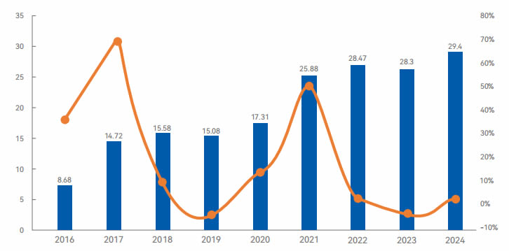 2024年全年,ZG工業(yè)機(jī)器人市場(chǎng)銷(xiāo)量超29.4萬(wàn)臺(tái)。盡管受整體制造業(yè)企業(yè)生產(chǎn)預(yù)期下降、市場(chǎng)需求收縮等因素影響,工業(yè) 機(jī)器人面臨著一系列的增長(zhǎng)壓力,市場(chǎng)仍處于去庫(kù)存和行業(yè)淘汰賽的關(guān)鍵階段,但同比2023年仍實(shí)現(xiàn)3.9%的微增。