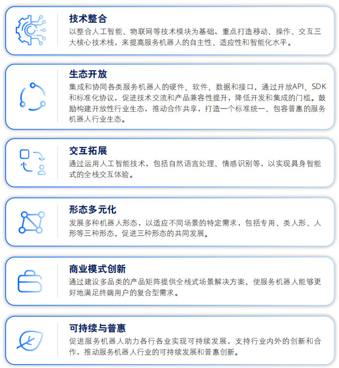 開放性的全棧式智能服務(wù)機(jī)器人生態(tài)是一個(gè)技術(shù)框架和商業(yè)模式的創(chuàng)新綜合體,旨在通過以AI為 核心的多技術(shù)棧和創(chuàng)新的商業(yè)模式,建立開放普 惠的行業(yè)生態(tài),實(shí)現(xiàn)服務(wù)機(jī)器人與一切可能的交 互對(duì)象(包括人、環(huán)境、其他機(jī)器人和軟硬件系 統(tǒng))之間的智能交互與萬(wàn)物互聯(lián),形成一個(gè)通用 的全棧式智能機(jī)器人體系。該生態(tài)的核心理念在 于開放性和通用性,通過構(gòu)建一個(gè)多面互通、無(wú)縫銜接的智能服務(wù)機(jī)器人生態(tài),來(lái)實(shí)現(xiàn)服務(wù)機(jī)器人在多樣化應(yīng)用場(chǎng)景中的深度融合和廣泛應(yīng)用。