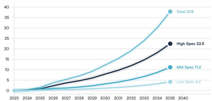 的總收入,到2050年可能產(chǎn)生約1萬億美元的總收入!边@一預(yù)測表明市場增長將出現(xiàn)急劇加速,特別是在2040年至2050年期間。