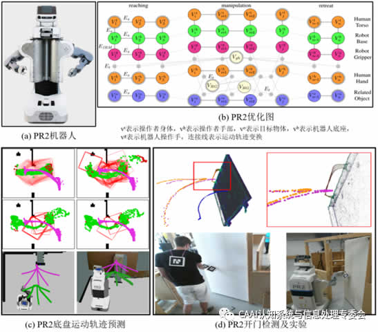 Personal Robot 2(PR2)[5]是Willow Garage開發(fā)的移動式操作機器人平臺(如圖2(a)),它配備兩個兼容7自由度機械臂和機械手,在頭部、胸部、肘部、夾爪上分別安裝有G分辨率攝像頭、激光測距儀、慣性測量單元、觸覺傳感器等豐富的傳感設(shè)備,通過底部的四輪移動平臺可無限擴(kuò)展其作業(yè)范圍,提供基于Ros系統(tǒng)的仿真環(huán)境,可模擬開門、打臺球和畫畫等復(fù)雜操作,適用于科研的實驗平臺。Welschehold[6]在PR2實現(xiàn)了從人的開門操作動作示教中學(xué)習(xí)移動底盤的運動方式以及夾持器的操作姿態(tài),作者將機器人的學(xué)習(xí)分為三個部分的軌跡預(yù)測包括示教者的手部運動軌跡、示教者的身體移動軌跡以及被操作物體的運動軌跡,后通過超圖優(yōu)化方式的來預(yù)測機器人底盤運動和操作機械臂的運動軌跡(如圖2(b)-(d))。
