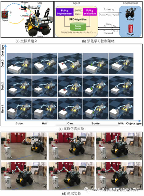 中科院沈陽自動(dòng)化所的Wang利用深度強(qiáng)化學(xué)習(xí)算法和視覺感知相結(jié)合的方法來完成移動(dòng)機(jī)器人(如圖3(a))在非結(jié)構(gòu)環(huán)境下的移動(dòng)操作[7]。作者將移動(dòng)操作過程看做一個(gè)標(biāo)準(zhǔn)的強(qiáng)化學(xué)習(xí)問題,首先通過雙目相機(jī)通過DOPE獲取目標(biāo)物體的6D姿態(tài)p以及機(jī)器人本體的當(dāng)前狀態(tài)st,接著通過基于PPO的強(qiáng)化學(xué)習(xí)算法預(yù)測機(jī)器人的本體,機(jī)械臂以及機(jī)械手的運(yùn)動(dòng)并控制機(jī)器人本體運(yùn)動(dòng),后機(jī)器人的運(yùn)動(dòng)狀態(tài)st+1和響應(yīng)rt,其中響應(yīng)主要包含了整個(gè)系統(tǒng)的控制響應(yīng)rctrl、機(jī)械手末端的位置響應(yīng)rdist以及抓取狀態(tài)rgrasp(如圖3(b))。后作者在仿真環(huán)境和真實(shí)環(huán)境下測試了不同G度下的抓取成功率,在仿真中,立方體的抓取效果好達(dá)到了90%的成功率,而球類物體較差僅有60%左右,而在實(shí)際測試過程中,在姿態(tài)估計(jì)正確的前提下可實(shí)現(xiàn)目標(biāo)物體的成功抓取(如圖3(c)(d))。