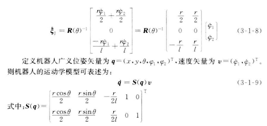 假定機器人在運動中質(zhì)心的線速度為v(t), 角速度為w(t), 左右兩輪的轉(zhuǎn)速分別為ψ和 中₂,機器人左右兩輪的運動速度分別為 VI, VR。給定r,1,θ, 以及根據(jù)圖3-1-3所示的幾 何關(guān)系,考慮到移動機器人滿足剛體運動規(guī) 律,下面的運動學(xué)方程(3-1-6)成立。