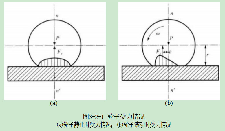 如果將法向反作用力F. 向后平移至通過輪子中心,與其垂線重合,則輪子在 地面上滾動(dòng)時(shí)的受力情況如圖3-2-2所示,出現(xiàn)一個(gè)附加的力偶矩T=F,e, 這個(gè) 阻礙車輪滾動(dòng)的力偶矩稱為滾動(dòng)阻力偶矩。由圖3-2-2可知,欲使輪子在地面上 保持勻速滾動(dòng),需要在輪軸上加一驅(qū)動(dòng)力矩r 或是加一推力Fp, 從而克服上述滾 動(dòng)阻力偶矩。相關(guān)數(shù)學(xué)關(guān)系如下所示。