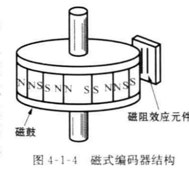 磁式編碼器是通過在強磁性材料表面上等 間隔的磁化刻度標尺,標尺旁邊相對放置磁阻 效應(yīng)元件或霍爾元件,即能檢測磁通的變化,如 圖4-1-4所示,兩個磁傳感器的距離恰好是磁化 標尺間隔的1/4. 因此可以根據(jù)輸出信號的相位 關(guān)系檢測旋轉(zhuǎn)方向。與光學編碼器相比,磁式編 碼器的刻度間隔大,但它具有耐油污、抗沖擊等 特點。