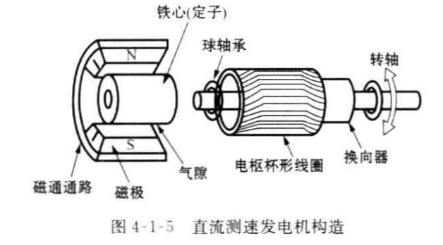 如圖4-1-5所示,直流測速發(fā)電機(jī)的定子是永久磁鐵,轉(zhuǎn)子是線圈繞組。它的 原理和永久磁鐵的直流發(fā)電機(jī)相同,轉(zhuǎn)子產(chǎn)生的電壓通過換向器和電刷以直流電 壓的形式輸出,可以測量0~10000r/min 量J的旋轉(zhuǎn)速度,線性度為0 . 1 % 。 此 外,停機(jī)時不易產(chǎn)生殘留電壓,因此,它Z適宜作速度傳感器。但是電刷部分是機(jī)械接觸,需要注意維修,另外,換向器在切換時產(chǎn)生脈動電壓,使測量精度降低。因 此,現(xiàn)在亦有用無刷直流測速發(fā)電機(jī)。