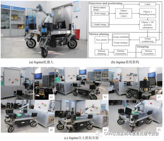 Jupiter[13]汕頭大學(xué)范衠團(tuán)隊(duì)研制的移動(dòng)操作機(jī)器人,該移動(dòng)機(jī)器人由四輪獨(dú)立轉(zhuǎn)向的底盤和UR5機(jī)械臂組成(如圖6(a))。通過2D激光雷達(dá)信息采用Hector SLAM實(shí)現(xiàn)機(jī)器人對(duì)地圖的感知和自主導(dǎo)航規(guī)劃,通過D部的RGB-D相機(jī)采集目標(biāo)物體深度和RGB圖像信息,并通過SSD網(wǎng)絡(luò)檢測目標(biāo)物體,通過坐標(biāo)轉(zhuǎn)換2D坐標(biāo)轉(zhuǎn)換為三維空間坐標(biāo),后通過UR5機(jī)械臂進(jìn)行抓取實(shí)驗(yàn)(如圖6(b))。通過實(shí)驗(yàn)測試,機(jī)器人單次完成導(dǎo)航、識(shí)別、抓取和放置的全流程需要大約212s,對(duì)單目標(biāo)的抓取成功率可達(dá)98%(如圖6(c))。