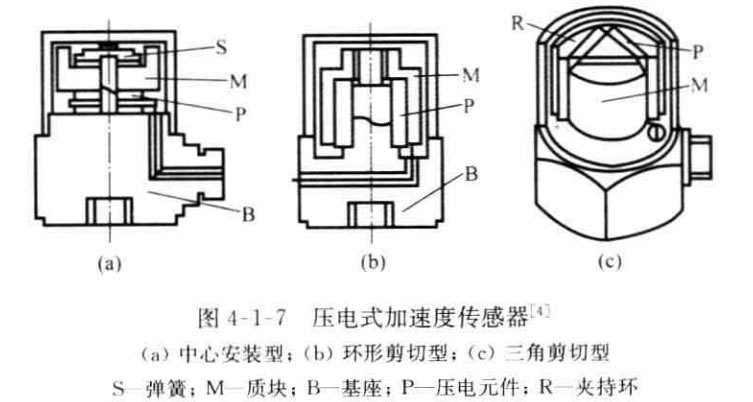 常用的壓電式加速度計(jì)的結(jié)構(gòu)形式如圖4-1-7所示。圖中(a) 是安裝壓 縮型,壓電元件 一質(zhì)量塊 一 彈簧系統(tǒng)裝在圓形中心支柱上,支柱與基座連接。這種 結(jié)構(gòu)有高的共振頻率。然而基座B 與測試對象連接時,如果基座 B 有變形則將直 接影響拾振器輸出。此外,測試對象和環(huán)境溫度變化將影響壓電元件,并使預(yù)緊力 發(fā)生變化,易引起溫度漂移。圖(c) 為三角剪切形,壓電元件由夾持環(huán)將其夾牢在 三角形中心柱上。加速度計(jì)感受軸向振動時,壓電元件承受切應(yīng)力。這種結(jié)構(gòu)對 底座變形和溫度變化有極好的隔離作用,有較高的共振頻率和良好的線性。圖(b) 為環(huán)形剪切型,結(jié)構(gòu)簡單,能做成極小型、高共振頻率的加速度計(jì),環(huán)形質(zhì)量塊粘到 裝在中心支柱上的環(huán)形壓電元件上。由于粘結(jié)劑會隨溫度增高而變軟,因此Z高 工作溫度受到限制。