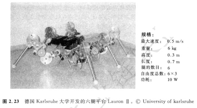 由于行走期間的靜態(tài)穩(wěn)定性,六腿結(jié)構(gòu)在移動(dòng)機(jī)器人學(xué)中已經(jīng)很流行(圖2.23 和圖1.3),因而降低了控制的復(fù)雜性。在大多數(shù)情況下,各條腿有3個(gè)自由度,包括
