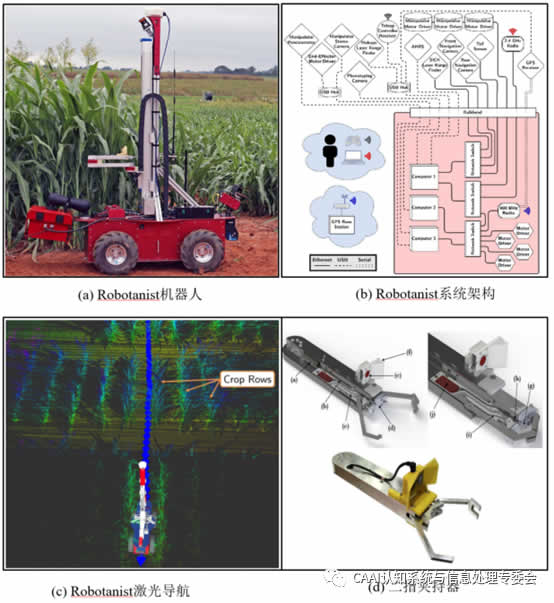 Robotanist[14][15]是卡內(nèi)基梅隆大學(xué)機器人學(xué)院FRC實驗室研制一款野外自主農(nóng)作物探測機器人(如圖7(a)(b)),機器人總重140kg,驅(qū)動系統(tǒng)由4個200W無刷直流電機構(gòu)成,通過50:1的空心軸減速機可以G達(dá)2m/s的速度在玉米、G粱等農(nóng)作物的地里前進(jìn)。機器人通過D端的GPS進(jìn)行全局定位,可實現(xiàn)10mm的定位精度。前后分別安裝有單線激光雷達(dá),用于檢測行進(jìn)過程中掉落的莖桿和障礙物(如圖7(c))。機器人的姿態(tài)是AHRS使用擴展卡爾曼濾波器(EKF)方法融合MTI等傳感器信息估計機器人相對與全局坐標(biāo)系的位姿。末端操作器采用二指加持器(如圖7(d)),主要用于加持植物的莖桿并對其進(jìn)行測量和數(shù)據(jù)采集。