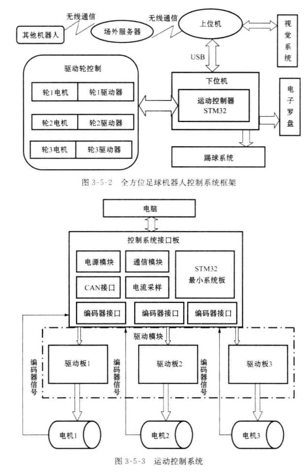 運(yùn)動(dòng)控制系統(tǒng)由通信模塊、電源模塊、控制模塊和電機(jī)驅(qū)動(dòng)模塊組成。一塊主 控制板(STM32) 控制3塊驅(qū)動(dòng)電路,分別驅(qū)動(dòng)3個(gè)全方位輪,實(shí)現(xiàn)3軸聯(lián)動(dòng)。當(dāng)機(jī)器人工作時(shí),通信模塊負(fù)責(zé)從PC 機(jī)接收指令數(shù)據(jù),包括3個(gè)輪子的速度和是否踢 球判斷以及踢球力度。控制模塊將3個(gè)輪子的速度發(fā)送到運(yùn)動(dòng)控制模塊,并產(chǎn)生 一個(gè)踢球信號(hào)控制氣動(dòng)踢球系統(tǒng)產(chǎn)生踢球動(dòng)作。運(yùn)動(dòng)控制模塊則控制著3個(gè)輪子 的速度,并且將通過閉環(huán)采集到的電機(jī)碼盤信息獲得的3個(gè)輪子的速度反饋回PC 機(jī),供機(jī)器人上層策略算法使用。其結(jié)構(gòu)圖如圖3-5-3。通信模塊和運(yùn)動(dòng)控制模塊的CPU采用的是 STM32F103CB。