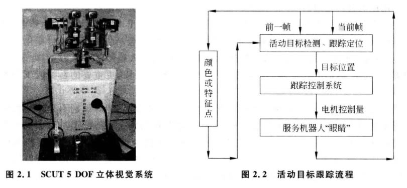 圖2.1所示的服務(wù)機(jī)器人“眼睛”是一個(gè)5 DOF 立體視覺系統(tǒng),它能夠跟蹤和識(shí)別活 動(dòng)的目標(biāo)。它是由 SCUT “智能計(jì)算機(jī)”科研團(tuán)隊(duì)研制成功的。該“眼睛”包括兩個(gè)彩色 攝像機(jī)、圖像處理板、個(gè)人電腦、數(shù)據(jù)采集卡、5個(gè)直流電機(jī)、直流電機(jī)驅(qū)動(dòng)器。考慮到主 動(dòng)跟蹤和目標(biāo)特征與速度和魯棒性等要求,該“眼睛”以基于顏色的跟蹤算法為基礎(chǔ),結(jié) 合目標(biāo)特征跟蹤及目標(biāo)運(yùn)動(dòng)預(yù)測等就可以對(duì)活動(dòng)目標(biāo)進(jìn)行跟蹤和識(shí)別。